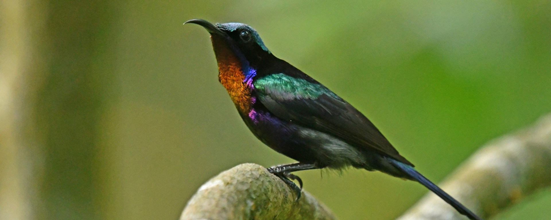 Copper-throated sunbird is a large sunbird found in mangroves. Male is completely covered with distinctive iridescent green crown and can appear dark all over with glistening wine-red throat and overall blue-green tones in good lighting. Female is far plainer, with a yellow belly, a pale throat, and a thin dark line through the eye.